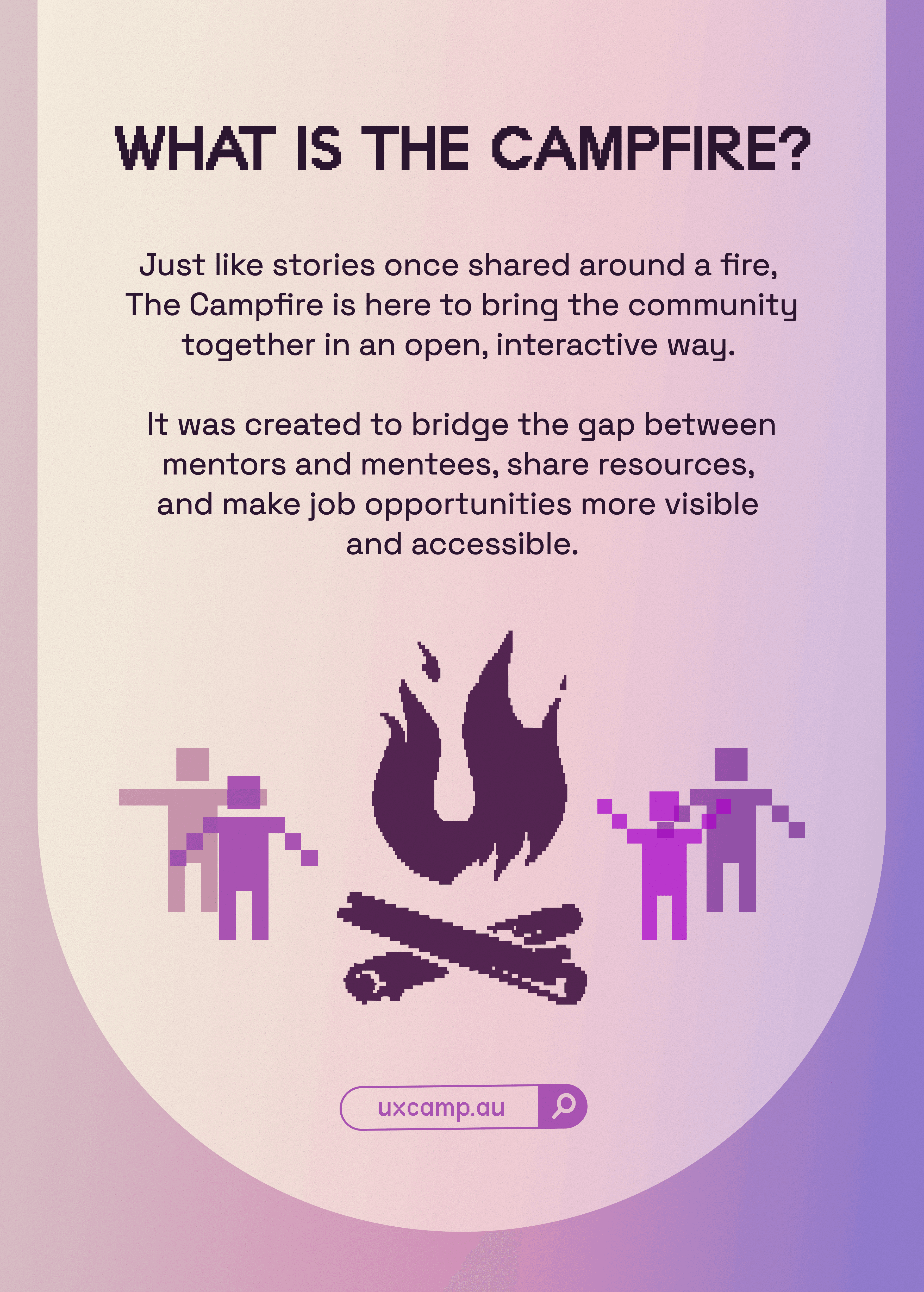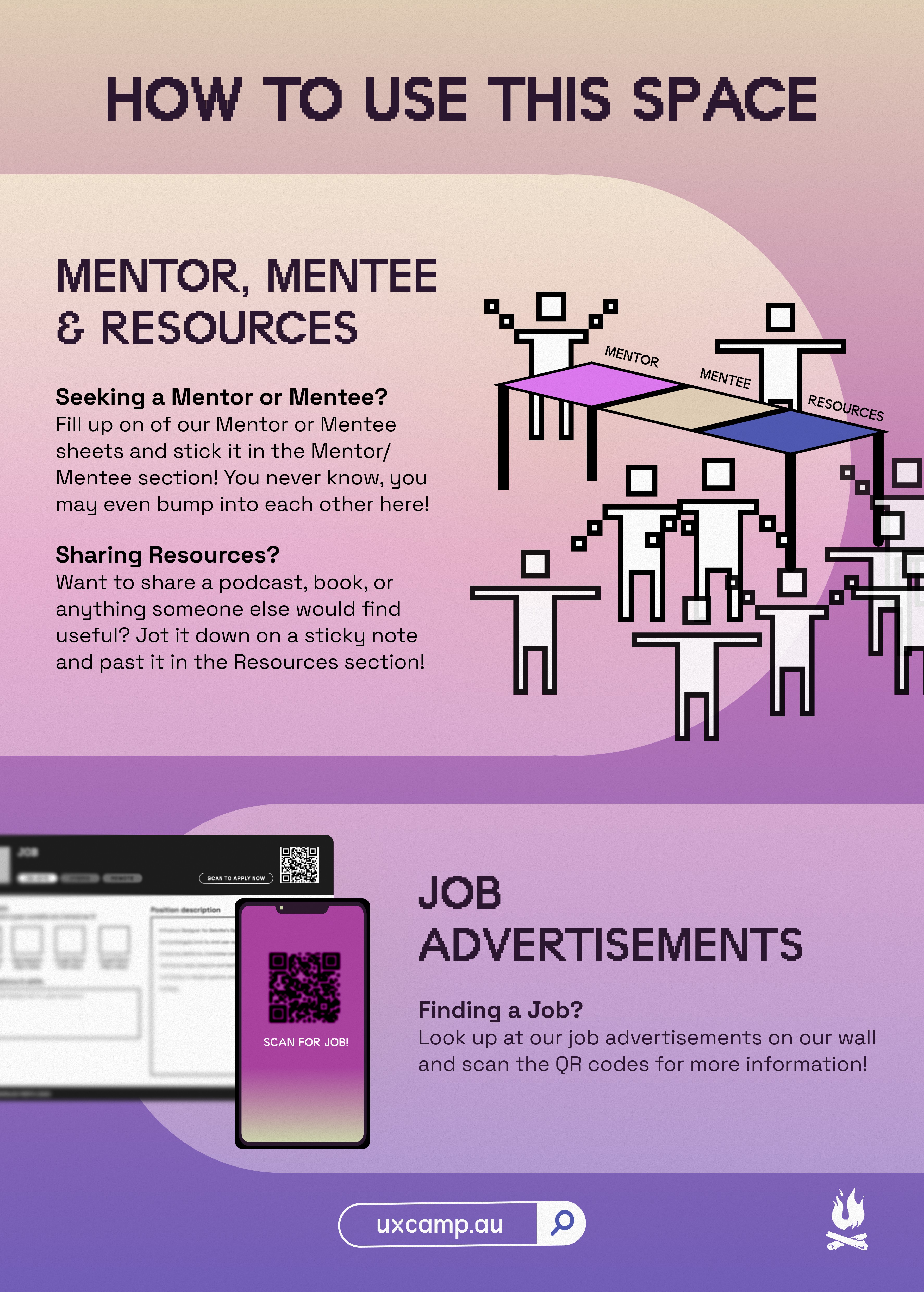 As part of the UX Camp Committee, I created a new space called "The Campfire", and evolution of the old career's board. Here, people could come together and find mentors or mentees, jobs, or to simply connect with one another. I ensured the banners and posters aligned with UX Camp’s 2025 purple ’80s retro theme, while keeping the designs simple and emphasising the presence of The Campfire space.